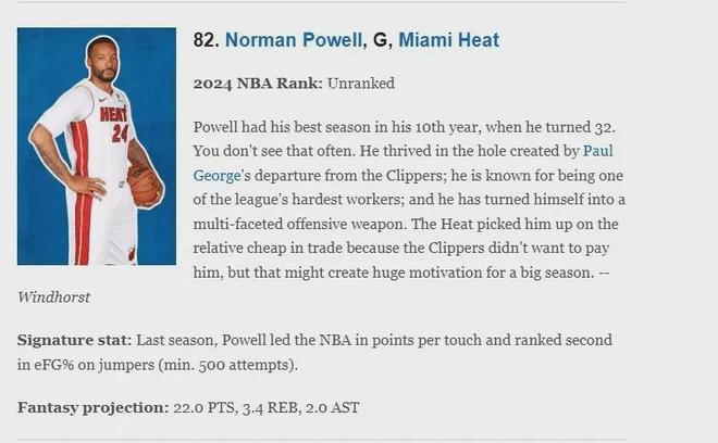 鲍威尔一直是饱受低估的球星,在赛季初ESPN评选的NBA2025-26赛季百大球星中,他仅排在第82位,网站评语如下:鲍威尔职业生涯最佳赛季是去年的第十个赛季,这种大器晚成情况并不常见,他把保罗-乔治的离开当做一次机会;他以勤奋著称,是联盟中最努力的球员之一;而且他已经把自己打造成一名全能进攻利器,由于快船队不愿意高薪续约,热火队以相对低廉的交易价格得到他,这或许会成为他在新赛季取得爆发的巨大动力。